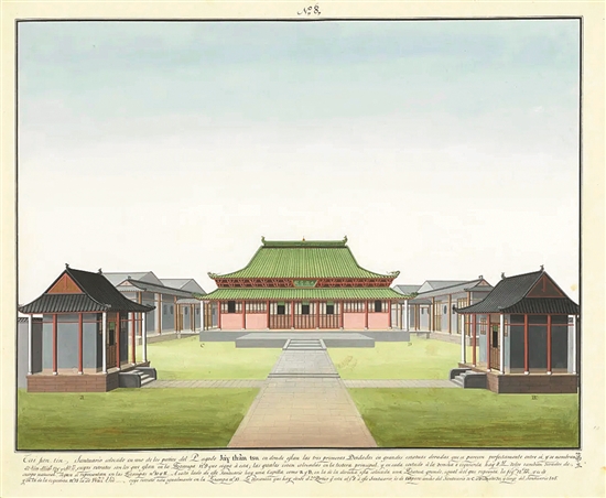 这一时期的许多游记与外销画都对海幢寺进行过详细记载和描绘。在这次展览的展品中,最引人注目的便是《1796年西班牙人阿格特订制海幢寺水彩画册》(如上图),此册共48开,其中44开为水彩画,每一页均以图解形式用水彩及描金详细描绘18世纪之海幢寺各庙宇近景及庙宇内所供奉神像,并附折叠式海幢寺测绘图,绘画之精细程度远超于其他18至19世纪的一系列外销画作品。