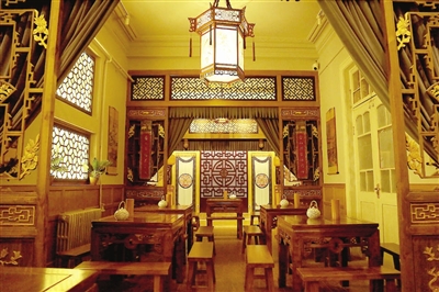 经过精心修缮装饰后,不同房间被打造成鹤竹堂药铺、瑞蚨祥成衣店、聚丰当铺、春和茶馆等老字号店铺,房间陈设布置尽显民国风貌。庭院内还设有西瓜摊、算卦摊、小吃摊等,而且每一个场景里,都有专属演员饰演药铺掌柜、成衣店老板娘等对应的五行八作,呈现出一个充满烟火气息的民国津沽街景。