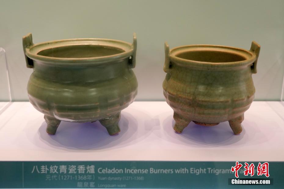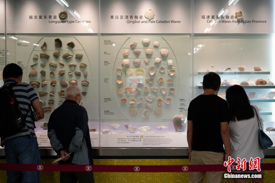 8月29日,众多香港市民正在港铁宋皇台站内参观“圣山遗粹—宋皇台出土宋元文物展”。该展览是香港首个在车站内设置的文物展览,400多件展品由香港古物古迹办事处在出土的70多万件宋元陶瓷碎片、宋代铜钱等文物中精选而来。2012年至2015年间,配合宋皇台站建设工程,港铁公司委讬考古专家于工程范围进行考古工作,结果出土大量宋元时期的考古遗存,包括宋代石构水井、70多万片宋元陶瓷碎片等。图为一对浙江龙泉窑八卦纹青瓷香炉。 中新社记者 张炜 摄