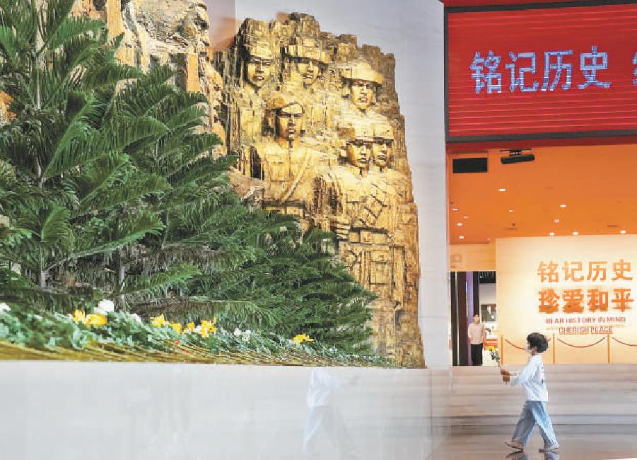 抗战馆序厅,一朵朵菊花整齐排列在铜墙铁壁浮雕墙前。北京大学外国语学院学生孙启说,历史刻骨铭心,不会被遗忘。我们青年党员应承担起启航新征程的时代使命,学习并发扬党的光荣传统和优良作风,坚定信念,把人生理想与国家命运联系在一起,为实现中华民族的伟大复兴贡献自己的一份力量。观众马女士带孩子到抗战馆参观。她说,要在孩子心里种下一粒爱国的种子。