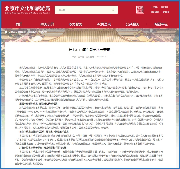 中国京剧艺术节是我国规模最大、水平最高的京剧艺术盛会,自1995年创办以来,至今已成功举办八届,推出了一大批优秀剧目和人才,为推动京剧艺术的传承发展发挥了重要作用。第九届中国京剧艺术节将于9月21日至10月15日举办。