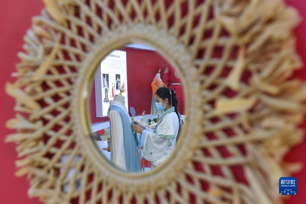 9月23日,在第十七届文博会山东展台,身着汉服的参展人员整理展示的汉服。