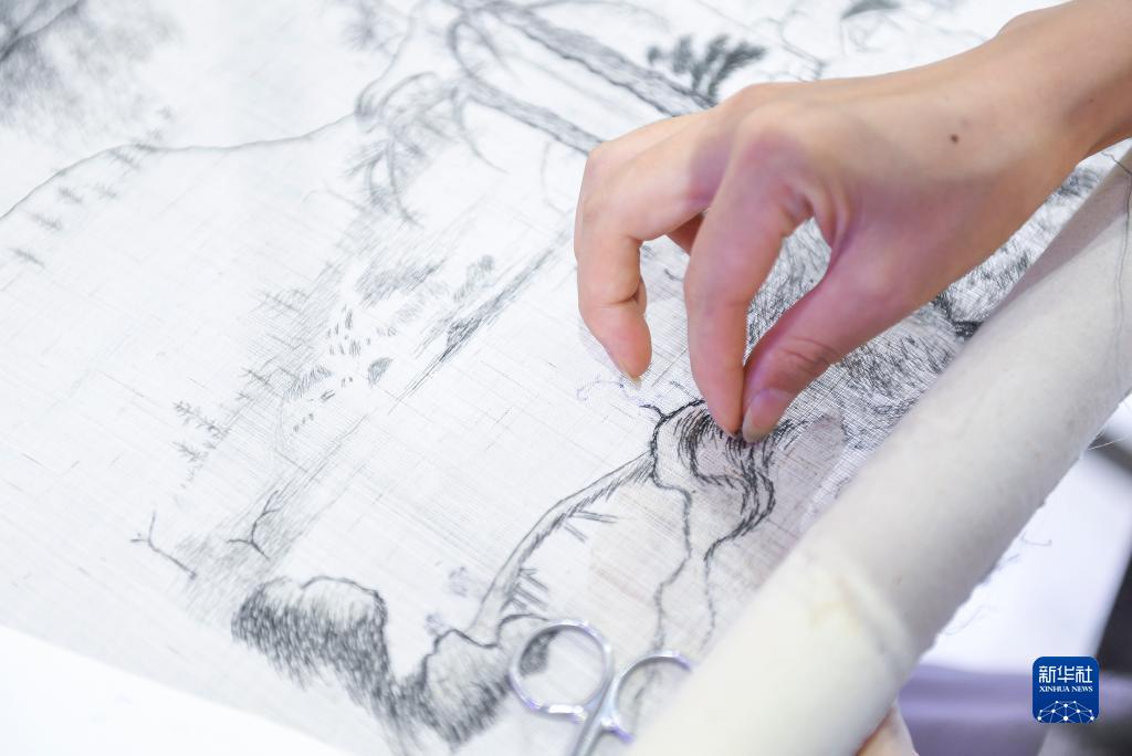 9月23日,参展者在第十七届文博会场馆江西展台展示非遗夏布绣。