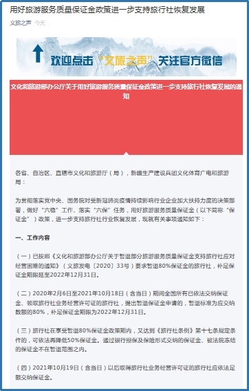 中工网讯 据“文旅之声”微信公众号10月19日消息,为贯彻落实党中央、国务院对受新冠肺炎疫情持续影响行业企业加大扶持力度的决策部署,做好“六稳”工作、落实“六保”任务,用好旅游服务质量保证金(下称“保证金”)政策,进一步支持旅行社行业恢复发展,文化和旅游部办公厅近日发布《关于用好旅游服务质量保证金政策进一步支持旅行社恢复发展的通知》,有关事项通知如下: