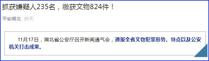 中工网讯 据平安湖北微信公众号消息,11月17日,湖北省公安厅召开新闻通气会,通报湖北省文物犯罪形势、特点以及公安机关打击成果。
