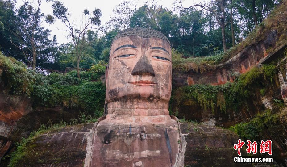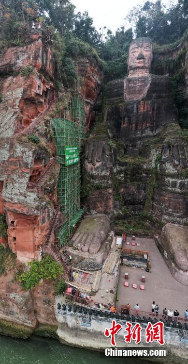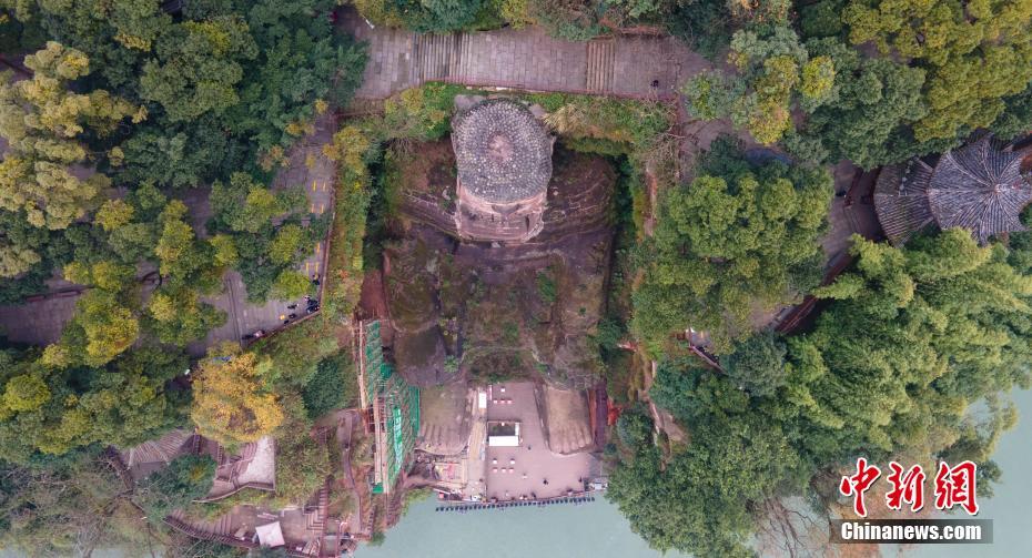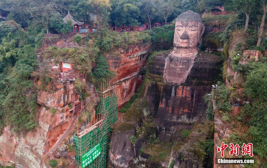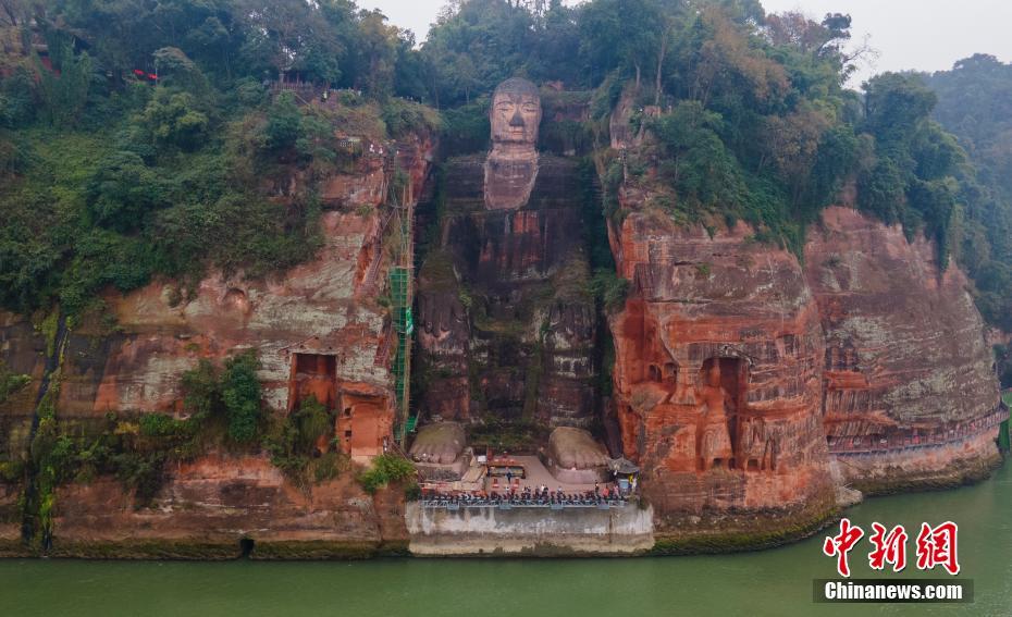 12月14日,四川乐山,乐山大佛九曲栈道区域正在搭建脚手架,即将开展危岩体抢险加固前期勘察工作。图为无人机拍摄的乐山大佛。中新社记者 刘忠俊 摄