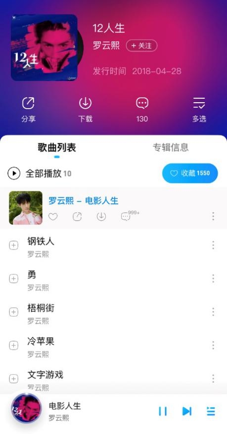 2018年,罗云熙在酷狗音乐发行首张个人专辑《12人生》,在音乐世界里“饰演”自己,将不同的人生角色一一诠释,把最长的电影娓娓道来,让听众重新认识到了不一样的罗云熙。也是这张《12人生》,在酷狗音乐掀起收听热潮,《电影人生》《钢铁人》《夏未央》《不是我》等多首单曲热评突破999+。