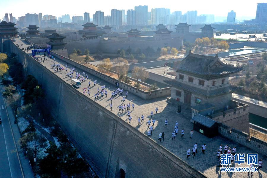 11月20日,参与者在山西省大同市的古城墙上跑步。
