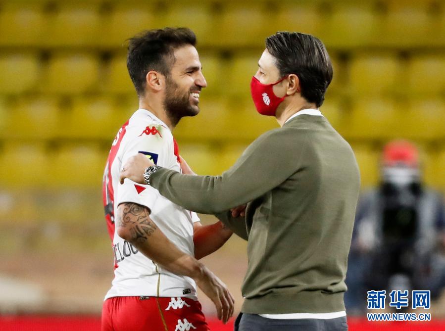 11月20日,摩纳哥队球员法布雷加斯(左)与主教练科瓦奇在比赛后庆祝。