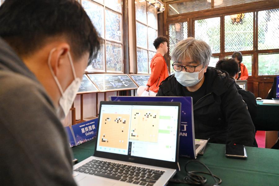 11月30日,中国人工智能星阵围棋(右)与韩国人工智能石子旋风在比赛中。