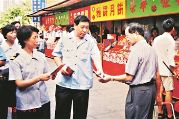 ⑧上世纪90年代初,杨荣久在车站外派发营销宣传单。