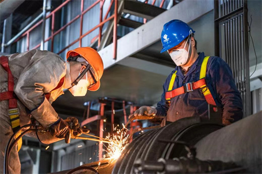 江苏工程技术公司的检修工正在更换锅炉制粉系统一次风管测点。(蒋少伟 摄)