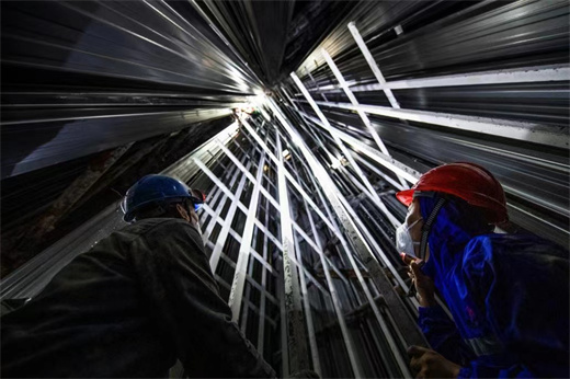 江西丰城电厂检修人员对4号炉电除尘阴阳极间距调整进行质量验收,力保A修中环保设备的整治工作圆满收官。(胡俊英 摄)