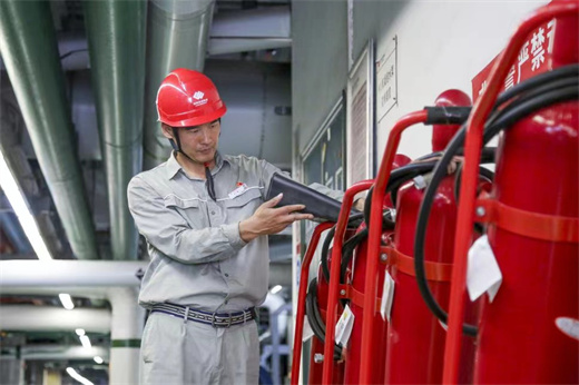 湖北荆州热电安全管理人员检查消防设备,保障机组安全稳定发电。(谢芳 摄)