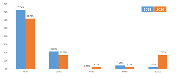 研究结果表明,2020年企业绿色发展信息公开整体情况优于2019年,总体提升约52%;主要原因是市场份额较大的企业绿色发展信息公开水平明显提高。