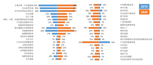 从公开信息内容来看,在汽车研发设计、汽车使用性能表现等方面2019年相比提升幅度较大,如企业主要产品品牌情况公开得分率高达96%,但如材料VOC管控、产品生态性能、生产废物排放等方面仍有较大提升空间;同时定量信息和年度改善情况总体透明度不高,得分率在20%以下。