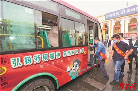 8月12日,车身喷绘着劳动元素的公交车载着劳模和乘客缓缓驶出云南省科学技术馆。