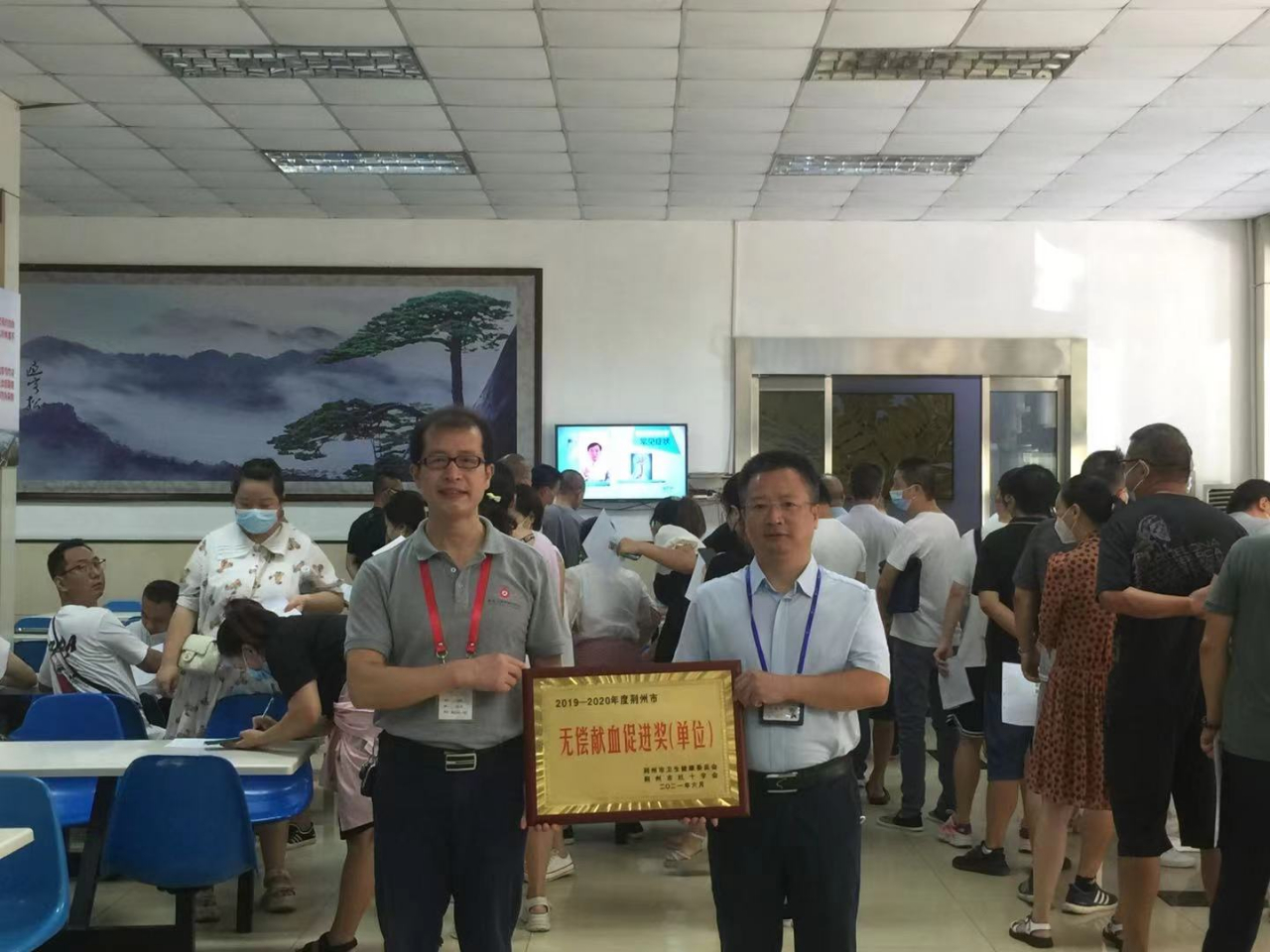 8月20日,湖北省荆州市中心血站为中国电信荆州分公司工会颁发“无偿献血促进奖(单位)奖牌。据介绍,今年是中国电信荆州分公司工会组织员工义务献血的第20个年头,累计献血人次达1100余人次。