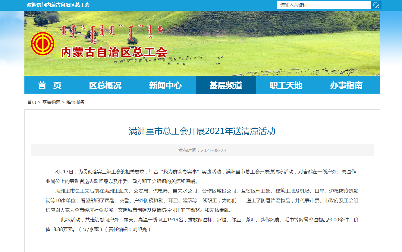 中工网讯 据内蒙古自治区总工会网站消息,,为贯彻落实上级工会的相关要求,结合“我为群众办实事”实践活动,内蒙古满洲里市总工会开展送清凉活动,对奋战在一线户外、高温作业岗位上的劳动者送去慰问品以及市委、政府和工会组织的关怀和温暖。