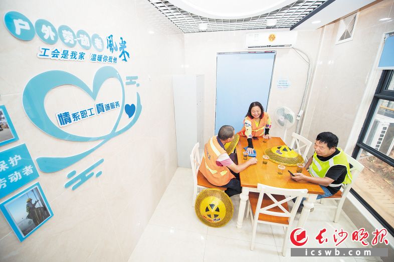工会户外劳动者服务站点(司马里站),3名环卫工人正在休息。长沙晚报全媒体记者黄启晴 摄