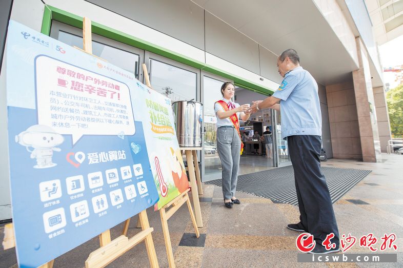 在中国电信长沙分公司荷花园营业厅,爱心大使给户外劳动者端上一杯水。长沙晚报全媒体记者黄启晴 摄