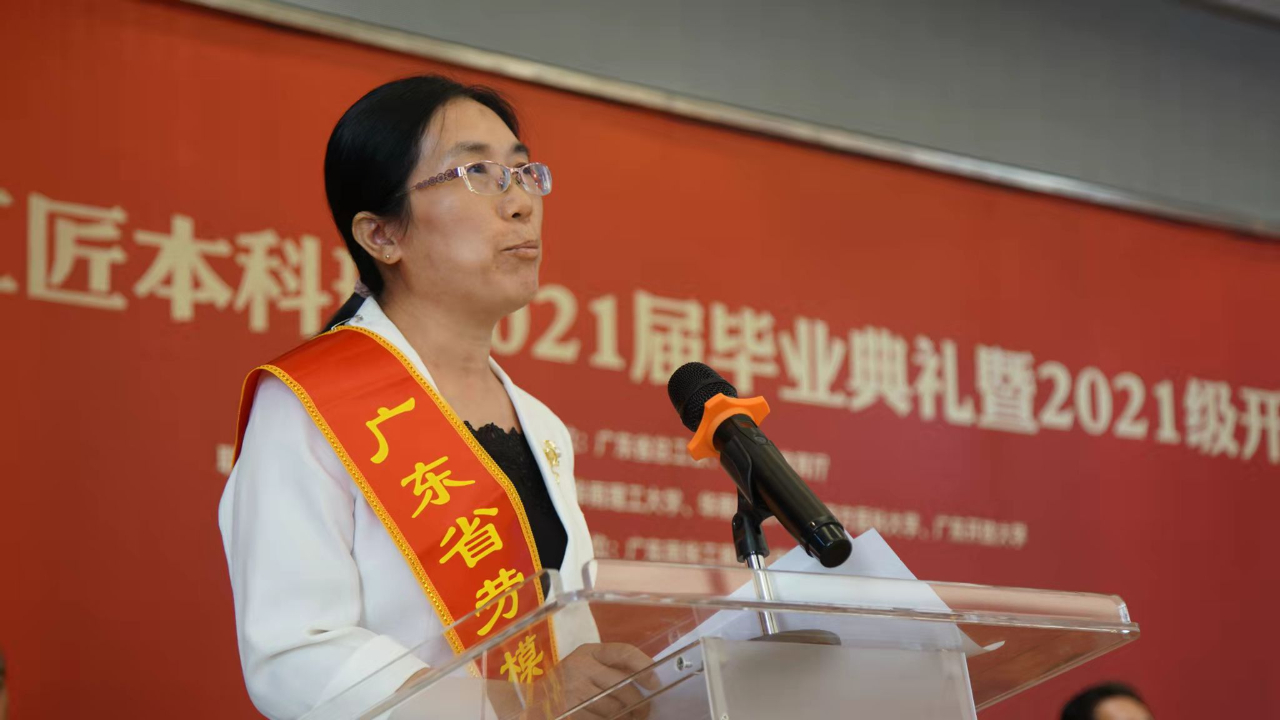 活动现场向2021届毕业生颁发了毕业证书,并举行了学士学位授予仪式。首届47名毕业生中,有4名劳模工匠学员获得学士学位证书。全国五一劳动奖章获得者、茂名石化首席技师张恒珍作为毕业生代表发言。