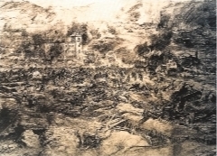 创作组的素描稿在贴近地平线的附近画出了塔山上空的硝烟,暗示着塔山阻击战的激烈,同时还画出了葫芦岛一带的海面,示意“重庆”号巡洋舰的位置。