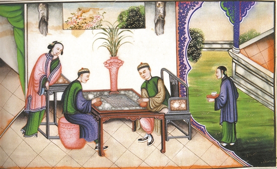 对弈图(19世纪 通草水彩画 广州博物馆藏)
