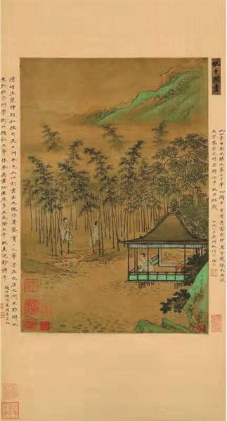 此图融山水、林木、亭阁于一体,疏密有致,色彩鲜丽。画中人物刻画细腻,形象传神,有如闲云野鹤。整个画面看上去就像一个世外桃源,仿佛负离子爆棚,观之令人暑热顿消。