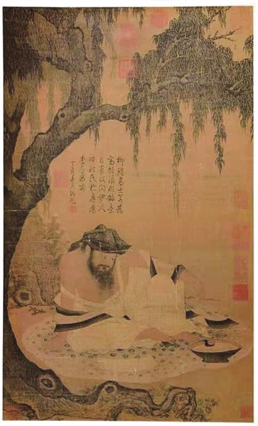 此图画一棵树干虬曲刚劲的古柳,枝繁叶茂。树下有一头戴葛巾、袒胸露腹的美髯公赤足而坐,凝视坐前一手卷,靠近双足处摆着一个盛满液体的桮,桮中还有杓。估计里面是酒,因其人神态略有醉意,似醺醺然不胜酒力。