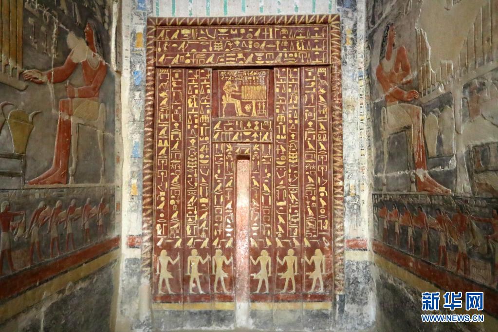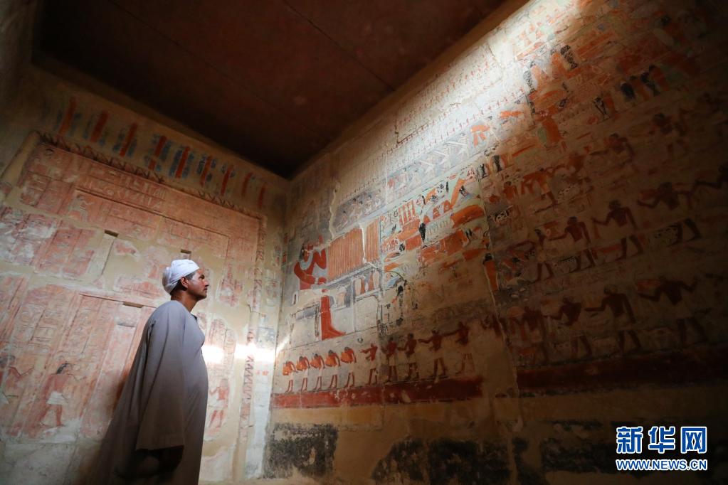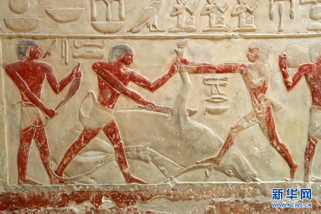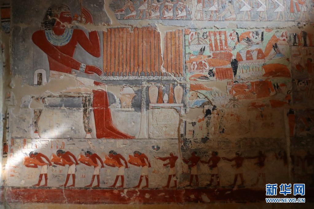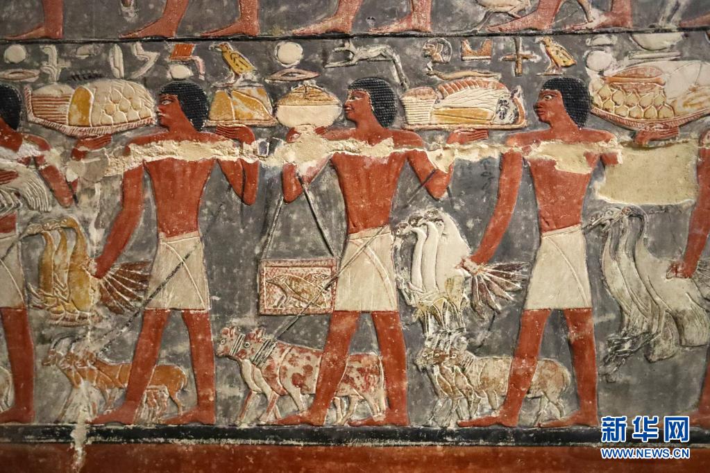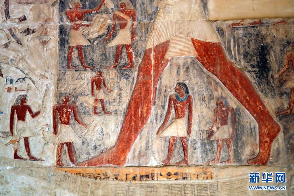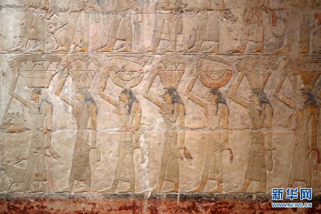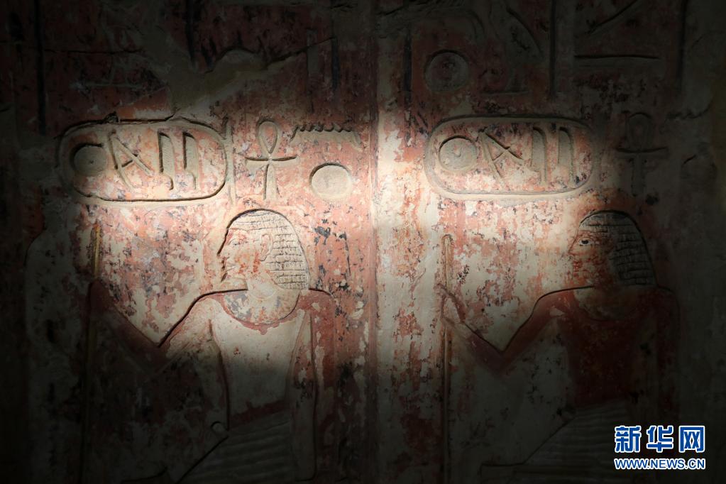 这是8月3日在埃及首都开罗以南的塞加拉地区一个官员墓内拍摄的彩绘浮雕壁画。