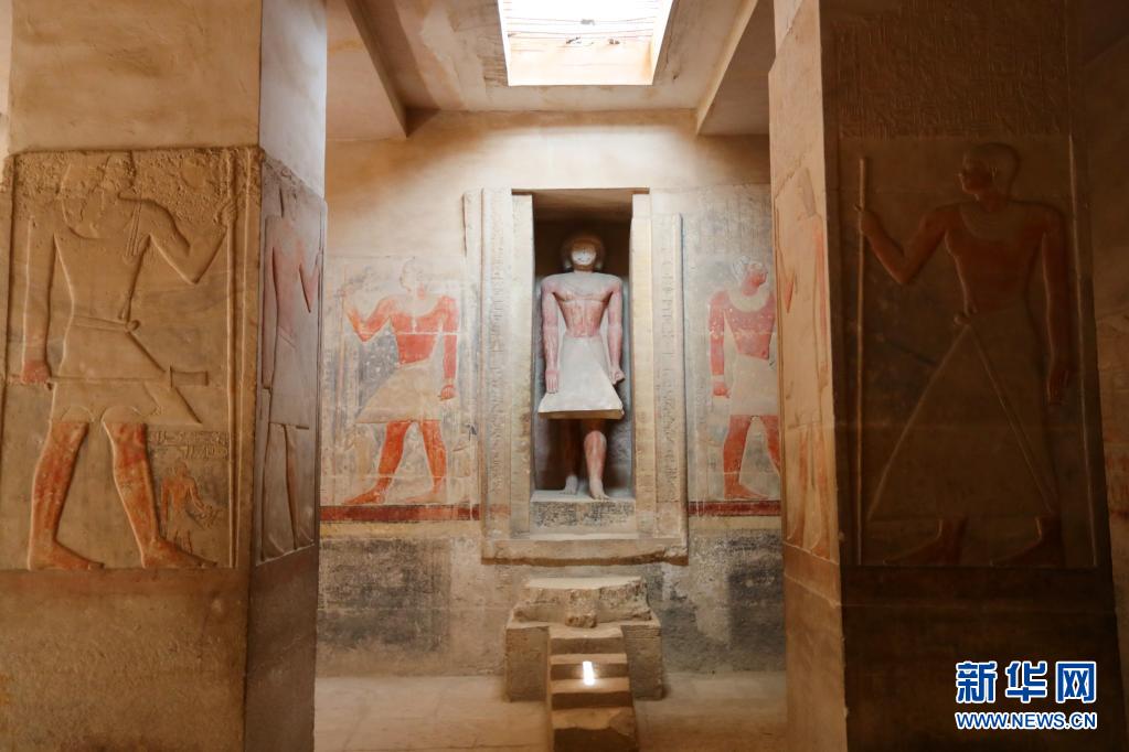 这是8月3日在埃及首都开罗以南的塞加拉地区一个官员墓内拍摄的彩绘浮雕壁画和墓主人雕像。