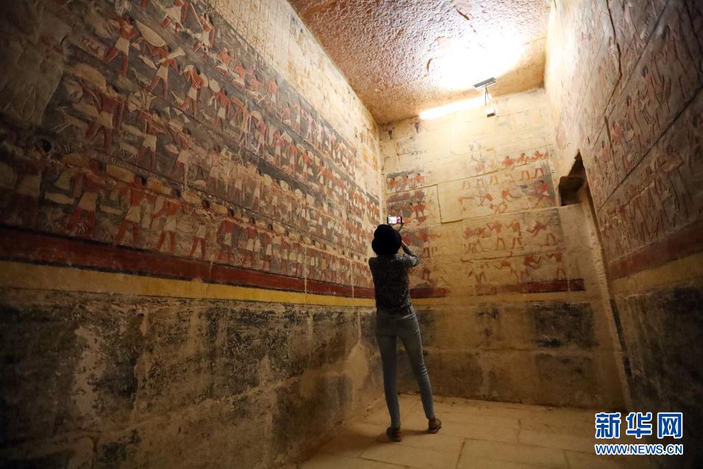 8月3日,游客在埃及首都开罗以南的塞加拉地区一个官员墓内拍摄彩绘浮雕壁画。
