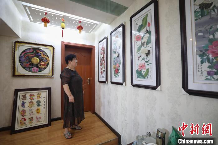 8月12日,尹守先在家中客厅内查看布艺堆绣作品。 瞿宏伦 摄