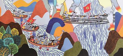 在一段爬雪山的画面中,皑皑雪山,阻挡不了红军战士们前进的步伐。山头的一条马尾巴来自于一个真实的故事。怀明富在当兵时的一堂军事课上,副司令说,他13岁参加红军长征,瘦小的他怕翻不过雪山,就哭了起来。他的营长有一匹马,鼓励他,拉着马尾巴就一定能翻过去。怀明富一直记得这个故事,这次就画到了作品中。在这幅画面上,他画了一位彝族人,背后其实是彝海结盟过凉山的历史故事。“红军不怕远征难,万水千山只等闲……”怀明富不由自主地背起了毛泽东的诗句。