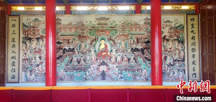 中新网兰州8月30日电 (记者 崔琳)30日,甘肃武威市凉州区政协副主席、鸠摩罗什寺方丈释理方接受中新网记者采访表示,绘制于该寺旃檀佛殿正面墙体上的大型临摹复制壁画《无量寿经变》已顺利竣工,将于近期对外开放。