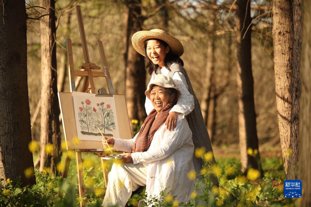 4月4日,尹玉凤和外孙女阿籽在户外写生。