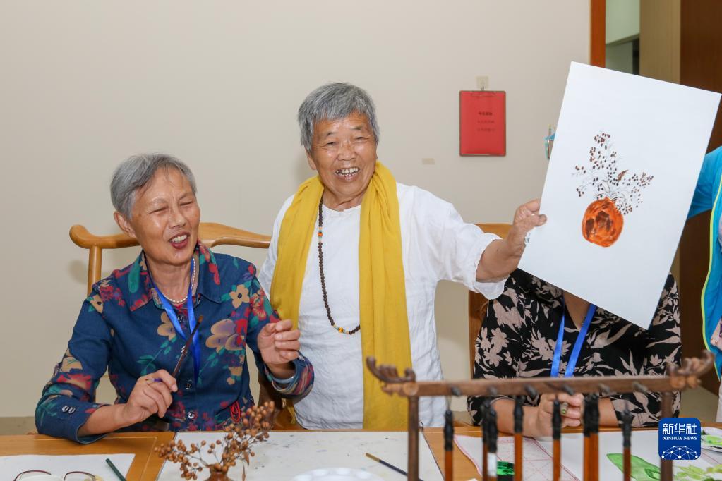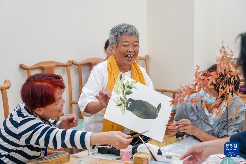 10月12日,尹玉凤和老年朋友交流画画感悟。