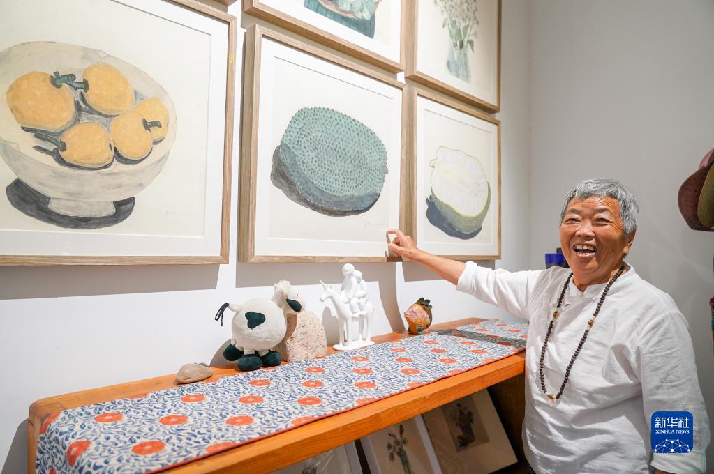 9月24日,尹玉凤在临港国际艺术园的工作室展示自己的绘画作品。