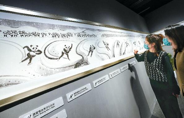 被誉为“中国画熊猫第一人”刘中的长卷绘画《冰雪国宝万里图》在市规划展览馆首次亮相。大熊猫化身奥运健儿,演绎109组冰雪运动项目。 北京晚报记者 方非 摄