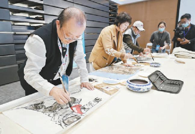 艺术家在描绘单板滑雪运动员。北京日报记者 刘平摄