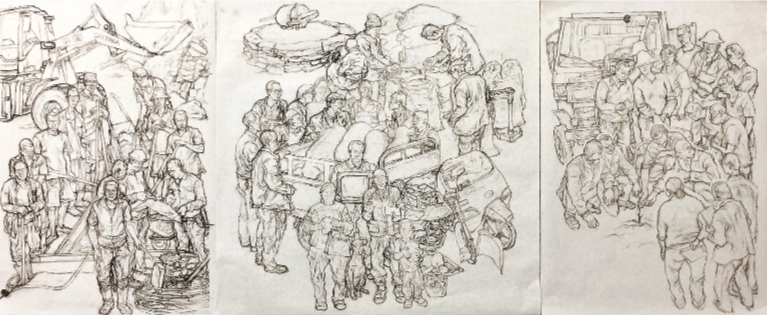 在谈到创作思路时,李诗鹏说,画面紧紧抓住救济式扶贫向开发式扶贫转变这一关键决策,由“致富修路”“科技下乡”“喜迎丰收”三个独立画面组成。居于画面左侧的“致富修路”是围绕“要想富先修路”这一思路展开。很多贫困山区和少数民族地区的贫困原因是落后的交通,所以基础设施建设成为解决贫困问题的先决条件。画面描绘的是山区修建水泥路,既快捷又节省成本,崎岖的山路和施工用的大型器械,使画面表现富有感染力。一组技术人员以及以农民为主体的施工人员,表现了劳动致富。