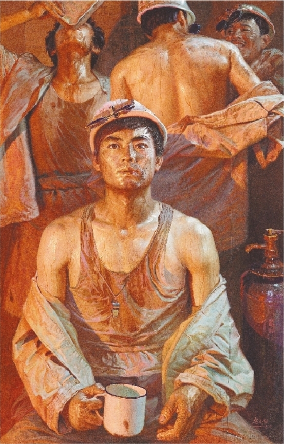 描绘工矿题材的美术作品数量很多,这其中,吴云华的创作非常突出。当年,吴云华经常深入工矿企业一线,了解矿工的生活与思想情感,以激情的油画语言表现矿工的劳动生活场面和精神世界。《乌金滚滚》为其最具代表性的作品,采用浑厚、浓重的色彩,奔放生动的笔法灵动安排整个画面的秩序。矿工下井行列与“乌金”在传送带上流泻的动势巧妙呼应,生动地表现了一群普通工人团结、乐观、强悍、坚毅的群体形象,也体现了新时期以来,现实主义画家突破“红、光、亮”的工人形象塑造模式,开拓艺术思维,强化油画本体语言的进程。同时吴云华是一位有着强烈使命感和责任感的画家,他的画笔有着更深层对时代、对生命、对人生的思考。