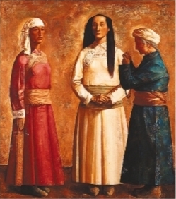 画面以蒙古族的传统习俗为线索,通过沉稳坚实的笔调对三位不同年龄的蒙古族妇女进行刻画。韦尔申将蒙式装束的外观与衣纹处理为棱角分明的平面和直线。这可看出艺术家对庄严、深沉、厚实、质朴和神圣等精神气质的向往,表达了他对这个富有沧桑感的民族的关注与思考。在制作上运用了多层覆盖、砂纸打磨的方法,露出丰富的色层变化。自制的蛋胶乳液使画面简洁有力。