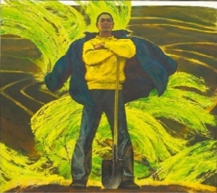 《潮》被誉为“20世纪80年代中国改革开放的缩影”。作者运用写实主义与表现主义相结合的创作手法和强烈的色彩对比,营造出富有冲击力的视觉效果,并以浪漫主义情怀描绘了改革开放后农民积极向上的新面貌。画面以仰视的视角重点刻画了一位顶天立地的青年农民——昂首挺立,目光坚定而自信。他站在绿潮涌动、充满希望的田野上,被春风掀起的大衣弧线与身后绿的色彩旋涡相呼应,形成一种意象性的表述语境。