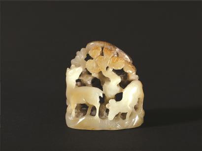 秋林群鹿的画面也同样常出现在玉器中。辽、金、元时期的玉器中常见海东青捕天鹅、大雁以及山林虎鹿的题材,它们最早系表现辽代契丹族“春捺钵”和“秋捺钵”弋猎生活的场景。这类玉饰被取名为“春水玉”和“秋山玉”,充满着浓厚的季节色彩。每年初秋,皇帝入山纳凉,同时带领群臣将士举行盛大的狩猎活动和祭祀仪式。辽代帝王举行“秋捺钵”时地点多在庆州(今内蒙古巴林右旗一带)诸山,故以“秋山”统称之。上海博物馆所藏的一件金代秋山玉饰描绘了三两只鹿于山林中悠然信步的场景;工匠通过“俏色”的装饰手法,巧妙地以黄色的玉皮表现变黄的树叶,传达出浓浓秋意。群鹿或低头饮水,或昂首回望,似乎已嗅到空气中猎手的危险气息。浪漫的秋日闲情与肃杀紧张的气氛,复杂地交织在这件一寸见方的小玉雕中。