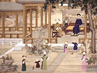 对和睦团圆的向往不分阶层,黔首百姓如此,皇家天子亦如是。《道光帝喜溢秋庭图》轴中描绘了秋日里道光帝携后妃、子女在庭园中赏花嬉戏的情景。园中湖石玲珑耸立,丛菊盛开,透出浓浓秋意。道光皇帝与皇后于厅中安坐,坐榻两旁的盆菊与前景处室外的景观构成了呼应,而屏风上的山水又拓宽了视野,串联起画面之外更广阔的空间。妃子、皇子与公主在庭院里与宠物嬉戏玩闹,品花赏秋,好一派温馨的家庭场景,其“喜”之洋“溢”真切可感。只有按照中国画传统安排的人物大小提醒着我们画中人物的身份尊卑之别:画中的主角不但是一个家庭中的男主人,更是坐拥江山的当朝天子。