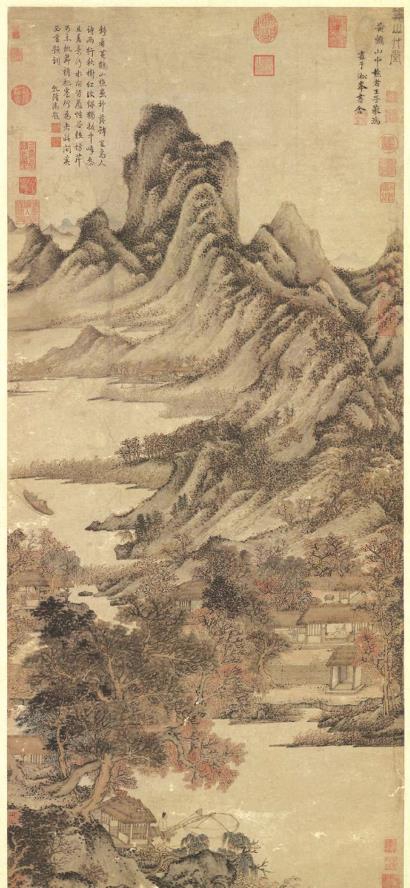在所有表现秋天景色的山水画中,最著名的大概莫过于元代画家赵孟頫的名作《鹊华秋色图》。赵孟頫出身宋代宗室,后经举荐仕元,历官翰林承旨、荣禄大夫、集贤学士、封魏国公;他既是元初政坛的高官,亦是才华横溢的画坛领袖,开启了有元一代的绘画新风,是中国绘画史、尤其是文人画史中的重要人物。《鹊华秋色图》为其山水画代表作,画中以小青绿画出齐州(今山东济南郊外)的两座名山:左方圆形平顶的为“鹊山”,右方双峰尖峭者为“华不注山”,故合称“鹊华秋色”。前景处平川烟渚,红树芦荻,几艘渔艇系于岸边,更衬出远方的山势巍峨。中景处平林漠漠,间有屋舍掩映于林中。两座高山于平原上拔地而起,遥遥相对,竟有一种殆非人境的魔幻之感。花青杂以石青染就的山色成为整幅画面中最为引人注意的重点,与前景处草木深浅不一的青色形成相互呼应;但真正笼罩画面的,是水边、浅滩、屋顶、树干和部分树叶以浅绛法染出的赭、红、黄色,它们是秋天悠长而惆怅的呼吸,是秋风过处万物灿烂的回应,是题名中“秋色”真正的落脚之处。
