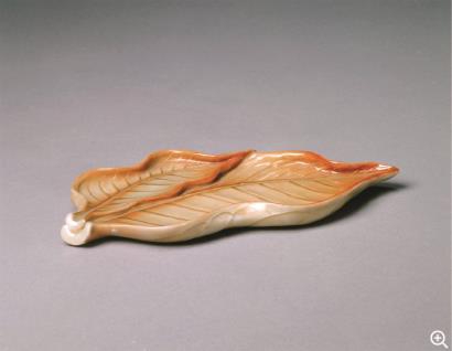 “榈庭多落叶,慨然知已秋。”秋天似乎多是在人们不知觉中悄然降临的。正所谓“见一叶落而知岁之将暮”,深沉的秋意往往蕴于微物毫末之间;一片落到跟前的初黄秋叶,往往便是秋声奏响的序曲。北京故宫博物院藏有一件乾隆时的黄釉描金秋叶形笔掭,通体施黄釉,叶缘红色渐深,恰如两片正在变色的红叶于初秋飘离枝头。器面叶脉施以描金,又于文人趣味中体现出皇家的贵气。“笔掭”亦名“笔觇”,是用毛笔写字时蘸墨吮毫、理顺笔锋的工具。明人文震亨在《长物志》“笔觇”一条中写道:“定窑、龙泉小浅碟俱佳,水晶、琉璃诸式,俱不雅,有玉碾片叶为之者,尤俗。”被标榜品位高标的文人嫌弃“尤俗”,则反可印证玉质叶形笔觇在当时的风靡。大概因其小而轻薄,正适于以落叶之形出现于案头,仿若被秋风偶然吹落于文房纸畔,使人于室内平起无限秋思。是以到了清代,依然有大量笔掭以叶形出现;而故宫此件尤为精巧,使人于挥毫之际,不免生出岁月如流之叹。