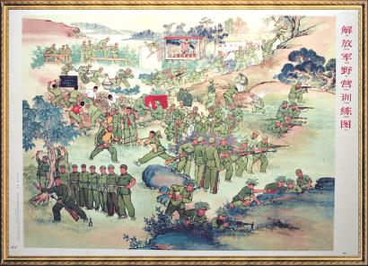 韩敏创作于1964年的年画《解放军野营训练图》浓缩了全军大比武过程中形式多样的训练场景,画出了解放军战士刻苦训练、敢打必胜的精神。